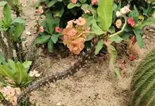 虎刺梅:别称铁海棠,是蔓生灌木植物。茎多分枝,长60-100厘米,直径5-10毫米,具纵棱,密生硬而尖的锥状刺,刺长1-1.5厘米,直径0.5-1.0 毫米,常呈3-5列排列于棱脊上,呈旋转。叶互生…全部>>