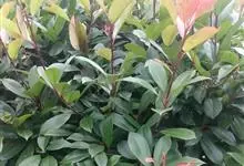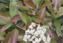 石楠 Kalkman),是蔷薇科石楠属的常绿乔木,高5~12米,株型紧凑,树冠圆球形。树枝为褐灰色;鳞片为褐色,没有毛;叶片革质,长椭圆至侧卵状椭圆形,有锯齿,新叶红色光亮。复伞房花序,白色小花,…全部>>