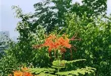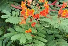 洋金凤 Sw.),豆科小凤花属灌木状或小乔木植物,枝无毛,绿或粉绿色;二回羽状复叶;总状花序伞房状,萼片无毛,花瓣橙红或黄色,圆形,花丝红色,子房无毛,花柱橙黄色;荚果窄而薄,…全部>>