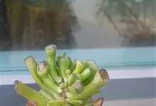 筒叶花月,是景天科青锁龙属的多年生草本植物。植株多分株,灌木状,茎较粗壮,圆柱形,表皮灰褐色;叶片肉质,互生,呈圆筒状,簇生于茎或分枝顶端,叶端呈斜截形,截面为椭圆形;花呈星状,淡白色;花期秋季。…全部>>