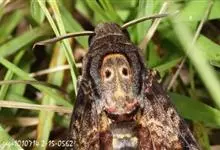 鬼脸天蛾,是鳞翅目天蛾科面形天蛾属动物。成虫翅展100~125毫米,体黑褐色;胸背有骷髅形斑纹;卵圆球形,直径约2毫米,淡黄绿色,表面光滑;老熟幼虫体长70~90毫米,蛹体长约56毫米;前翅为褐色,…全部>>