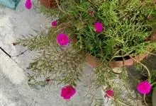 大花马齿苋:一年生草本,高10-30厘米。茎平卧或斜升,紫红色,多分枝,节上丛生毛。叶密集枝端,较下的叶不规则互生,叶片细圆柱形,无毛。花单生或数朵簇生枝端,直径2.5-4厘米,…全部>>