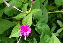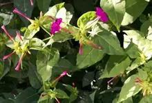 即紫茉莉,英文名:Four-o'clock,Marvel of Peru,为紫茉莉科、紫茉莉属多年生草本植物,一年生栽培。株高50~80cm。根粗壮,茎多分枝而散生。叶对生,卵形或心脏形。花数朵簇生…全部>>