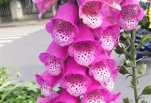 毛地黄是车前科、毛地黄属一年生或多年生草本植物。株高0.5—1米,茎直立,少分枝,全株被灰白色短柔毛和腺毛叶基生,呈莲座状,卵圆形或卵状披针形。顶生总状花序,花冠钟状,紫红色,内面有浅白斑点。菊果卵形。…全部>>