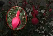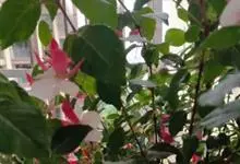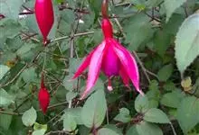 倒挂金钟是柳叶菜科倒挂金钟属亚灌木植物。茎直立,多分枝;幼枝带红色,被短柔毛与腺毛,老时渐无毛;叶对生,卵形或窄卵形,脉常带红色;常带红色,被短柔毛与腺毛;花筒红色,筒状钟形,…全部>>