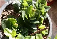 唐印为景天科伽蓝菜属的多年生肉质草本植物。植株中型,株高50厘米,宽20厘米,多分枝;叶片肉质,对生,卵形,全缘,先端钝圆,叶片淡绿色至灰绿色,表面被有厚厚的白粉,光照充足时,叶缘呈红色;圆锥花序,…全部>>