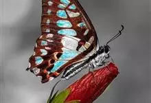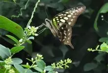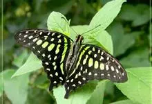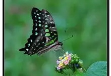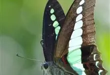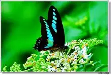 青带凤蝶Graphium sarpedon ,又名青凤蝶,是最普遍的中型凤蝶,飞行速度很快。青带凤蝶的翅膀中央有许多浅蓝色的斑点,很整齐地排列成一条直线。这些斑点由上而下逐渐变大,就像一条青色的带子。全部>>