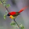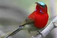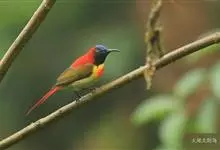 火尾太阳鸟为太阳鸟科太阳鸟属的鸟类。体长20厘米,色彩艳丽。雄鸟红色,具形长的艳猩红色中央尾羽。头顶金属蓝色,眼先和头侧黑色,喉及髭纹金属紫色。下体黄色,胸具艳丽的橘黄色块斑。雌鸟灰橄榄色,腰黄,…全部>>