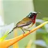 绿喉太阳鸟:共有9个亚种。小型鸟类,雄鸟体长13-15厘米、雌鸟10-12厘米。雄鸟前额至后颈、颏和喉辉绿色,头侧黑色,颈侧和背暗红色,两肩、下背橄榄绿色,腰鲜黄色,尾上覆羽和中央尾羽暗绿色,…全部>>