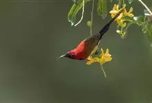 黄腰太阳鸟共有16个亚种,小型鸟类,体长10-15厘米。嘴细长而向下弯曲,雄鸟额和头顶前部金属绿色,头顶后部橄榄褐色。其余头、颈、背、肩、颏、喉、胸以及翅上中覆羽和小覆羽概为红色,腰黄色,…全部>>