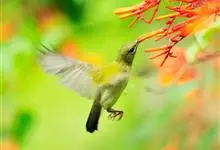 绿喉太阳鸟:共有9个亚种。小型鸟类,雄鸟体长13-15厘米、雌鸟10-12厘米。雄鸟前额至后颈、颏和喉辉绿色,头侧黑色,颈侧和背暗红色,两肩、下背橄榄绿色,腰鲜黄色,尾上覆羽和中央尾羽暗绿色,…全部>>