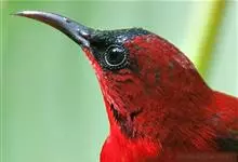 叉尾太阳鸟,雀形目太阳鸟科太阳鸟属留鸟;为小型鸟类,雄鸟头顶辉蓝绿色,上体橄榄绿色,腰明黄色,中央尾羽亮翠蓝色,羽轴针状延长,外侧尾羽黑色具白色端斑,头侧黑色,颜、喉和胸为绛红色,…全部>>