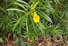 黄花夹竹桃K. Schum.),又名“酒杯花”“柳木子”“黄花状元竹”,是夹竹桃科,黄花夹竹桃属下的常绿乔木植物。高达5m,全株无毛,树皮棕褐色;叶互生,近革质,线形或线状披针形;花大,黄色,具香味,…全部>>