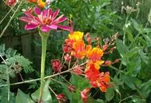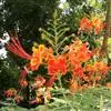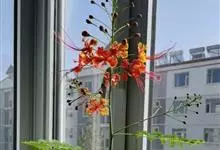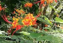 洋金凤 Sw.),豆科小凤花属灌木状或小乔木植物,枝无毛,绿或粉绿色;二回羽状复叶;总状花序伞房状,萼片无毛,花瓣橙红或黄色,圆形,花丝红色,子房无毛,花柱橙黄色;荚果窄而薄,…全部>>
