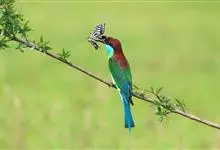 蓝喉蜂是蜂虎科蜂虎属鸟类。体长26-28厘米,嘴长而弯曲,有明显细长的中央尾羽。头部、颈部和背部为巧克力色,有黑色眼纹。喉部、腰部和尾羽为蓝色。腹部和两翼为绿色。幼鸟外观似成鸟,头部、颈部和背部为绿色,…全部>>
