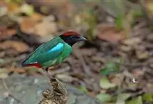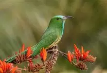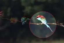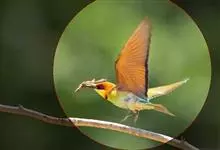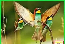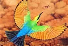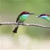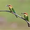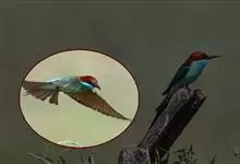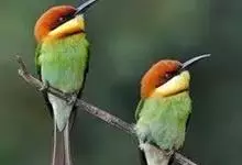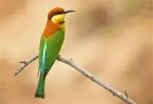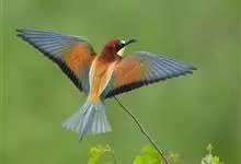 栗喉蜂虎是蜂虎科蜂虎属的鸟类。有热带鸟类羽毛艳丽的特征:喉部是栗红色的,黑色的过眼纹,翅膀和背部是绿色的,尾翼是蓝色的,飞行时翅膀下面的羽毛是橙黄色的,在阳光的照射下,它们全身闪烁着金属般的艳丽光泽,…全部>>