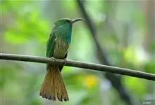 蓝须夜蜂虎是佛法僧目、蜂虎科的鸟类,体长约30厘米,是绿色林栖型蜂虎,蓝色的胸羽蓬松,嘴厚重而下弯。成鸟顶冠淡蓝,腹部棕黄带绿色纵纹。尾羽腹面黄褐。亚成鸟全身绿色。喉、胸部中央的羽甚长和亮色;该物种…全部>>