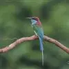 蓝喉蜂是蜂虎科蜂虎属鸟类。体长26-28厘米,嘴长而弯曲,有明显细长的中央尾羽。头部、颈部和背部为巧克力色,有黑色眼纹。喉部、腰部和尾羽为蓝色。腹部和两翼为绿色。幼鸟外观似成鸟,头部、颈部和背部为绿色,…全部>>