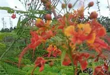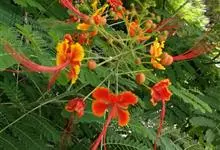 洋金凤 Sw.),豆科小凤花属灌木状或小乔木植物,枝无毛,绿或粉绿色;二回羽状复叶;总状花序伞房状,萼片无毛,花瓣橙红或黄色,圆形,花丝红色,子房无毛,花柱橙黄色;荚果窄而薄,…全部>>