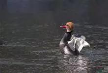 赤嘴潜鸭俗称大红头,是大型鸭类,个体比绿头鸭小,体长45-55厘米,体重1千克左右。雄鸟头浓栗色,具淡棕黄色羽冠。上体暗褐色,翼镜白色,嘴赤红色。下体黑色,两胁白色,特征极明显,野外容易辨别。…全部>>