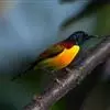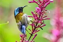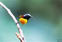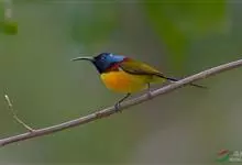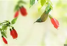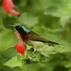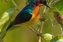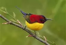 绿喉太阳鸟:共有9个亚种。小型鸟类,雄鸟体长13-15厘米、雌鸟10-12厘米。雄鸟前额至后颈、颏和喉辉绿色,头侧黑色,颈侧和背暗红色,两肩、下背橄榄绿色,腰鲜黄色,尾上覆羽和中央尾羽暗绿色,…全部>>