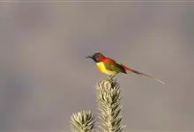 火尾太阳鸟为太阳鸟科太阳鸟属的鸟类。体长20厘米,色彩艳丽。雄鸟红色,具形长的艳猩红色中央尾羽。头顶金属蓝色,眼先和头侧黑色,喉及髭纹金属紫色。下体黄色,胸具艳丽的橘黄色块斑。雌鸟灰橄榄色,腰黄,…全部>>