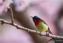 叉尾太阳鸟,雀形目太阳鸟科太阳鸟属留鸟;为小型鸟类,雄鸟头顶辉蓝绿色,上体橄榄绿色,腰明黄色,中央尾羽亮翠蓝色,羽轴针状延长,外侧尾羽黑色具白色端斑,头侧黑色,颜、喉和胸为绛红色,…全部>>