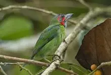 金喉拟啄木鸟,是须鴷科、拟啄木鸟属的鸟类。金喉拟啄木鸟为小型鸟类,体长19-24厘米。额深红色,头顶金黄色,后枕具一大块深红色斑,耳羽和头侧银灰色,上体草绿色,颏和上喉金黄色,下喉淡银灰色,…全部>>