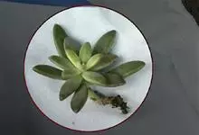 姬胧月是蔷薇目景天科植物。姬胧月株形和风车草属胧月极为相似。花瓣被蜡,叶排成延长的莲座状被白粉。平时为绿色,日照充足时叶色为朱红带褐色,叶呈瓜子型,叶末较尖,开黄色小花,…全部>>