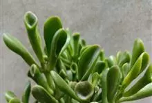 筒叶花月,是景天科青锁龙属的多年生草本植物。植株多分株,灌木状,茎较粗壮,圆柱形,表皮灰褐色;叶片肉质,互生,呈圆筒状,簇生于茎或分枝顶端,叶端呈斜截形,截面为椭圆形;花呈星状,淡白色;花期秋季。…全部>>