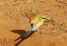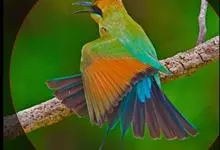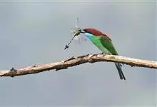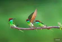 栗喉蜂虎是蜂虎科蜂虎属的鸟类。有热带鸟类羽毛艳丽的特征:喉部是栗红色的,黑色的过眼纹,翅膀和背部是绿色的,尾翼是蓝色的,飞行时翅膀下面的羽毛是橙黄色的,在阳光的照射下,它们全身闪烁着金属般的艳丽光泽,…全部>>