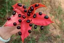 假苹婆是锦葵科苹婆属乔木植物。幼枝被毛;叶椭圆形或披针形,先端骤尖,基部钝或近圆无毛;圆锥花序腋生,花淡红色;蓇葖果鲜红色,长卵圆形或长椭圆形;种子卵圆形黑褐色;花期4-6月。…全部>>