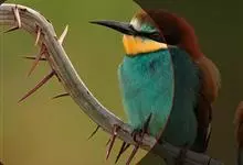 栗喉蜂虎是蜂虎科蜂虎属的鸟类。有热带鸟类羽毛艳丽的特征:喉部是栗红色的,黑色的过眼纹,翅膀和背部是绿色的,尾翼是蓝色的,飞行时翅膀下面的羽毛是橙黄色的,在阳光的照射下,它们全身闪烁着金属般的艳丽光泽,…全部>>