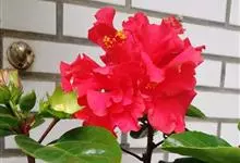 重瓣朱槿是锦葵科、木槿属常绿灌木植物;小枝疏被星状柔毛单叶互生,卵形或卵状披针形,基部圆形;叶柄长;托叶早落;花重瓣,较朱槿为大;花萼小,钟形,基部具有苞片多枚;花瓣多枚排列成彩球状,…全部>>