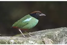 绿胸八色鸫:是雀形目八色鸫科的鸟类,共有12个亚种。体长为16-18厘米,体重65-69克。体型圆胖,尾短,腿长。头黑,上体绿色,两翼深色而具白色斑纹,头顶至后枕深褐,胸及腹部苹果绿,臀亮红。…全部>>
