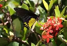 金裳凤蝶是凤蝶科、裳凤蝶属的动物。金裳凤蝶身体呈黑色,头、颈和胸侧有红毛,腹部有黑黄两色相间条纹,雄蝶前翅黑色,具黑天鹅绒光泽,各脉两侧灰白色,后翅金黄色,各室外缘有等腰三角形黑斑1枚,斑内侧有晕,…全部>>
