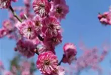 宫粉梅 Rehd.)是蔷薇科、李属植物,梅花品系中真梅系直枝梅类宫粉型,其花复瓣至重瓣,呈或深或浅的红色。落叶乔木,高达10米。树干褐紫色,有纵驳纹,小枝细而无毛,多为绿色。叶广卵形至卵形,…全部>>
