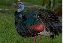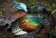 眼斑吐绶鸡:是火鸡科的两种鸟类之一。体型比普通火鸡略小些,体长1米左右,体重2.4-5.4千克,雄性比雌性略大,长得很特别,蓝色的秃脑袋上冒出几个橙黄色的疙瘩。但是它羽色艳丽,身体呈铜色及绿色。…全部>>