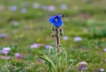 五脉绿绒蒿是罂粟科、绿绒蒿属植物。多年生草本,高30-50厘米,基部盖以宿存的叶基。叶全部基生,莲座状,叶片倒卵形至披针形,长2-9厘米。花瓣4-6,倒卵形或近圆形,长3-4厘米,淡蓝色或紫色。…全部>>