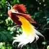 大极乐鸟是极乐鸟属中最大的鸟种。成年雄鸟体长可达到43厘米,雌性可达35厘米。雄鸟的额、颊、喉等墨绿色;头、颈黄色;上体暗赤栗色;腹部葡萄红色,胁部有长饰羽,其基部橙黄,中部黄色,…全部>>