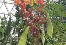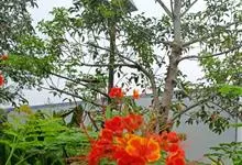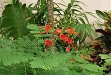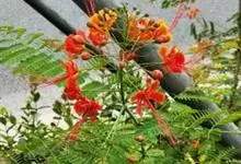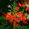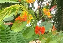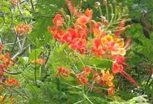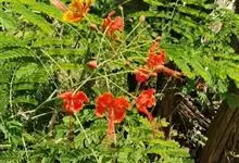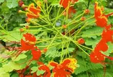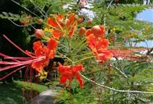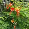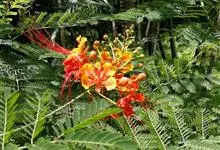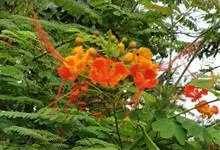洋金凤 Sw.),豆科小凤花属灌木状或小乔木植物,枝无毛,绿或粉绿色;二回羽状复叶;总状花序伞房状,萼片无毛,花瓣橙红或黄色,圆形,花丝红色,子房无毛,花柱橙黄色;荚果窄而薄,…全部>>