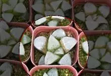 白银寿Haworthia emelyae var.emelyae Poelln.,中文惯称白银寿,是小型多肉植物,原产于南非开普省。肉质叶呈莲座状排列,叶色深绿或红褐色,顶端二角形,稍凸起,透明,…全部>>