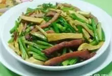 韭菜炒香干是一道菜品,制作原料主要有韭菜、香干等。鲜嫩可口,有点小小的微辣,加入切成段的韭菜,翻匀,…全部>>