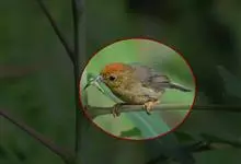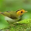 棕脸鹟莺:体长10厘米,是一种色彩亮丽而有特色的莺鸟。头栗色,具黑色侧冠纹。上体绿,腰黄色。下体白,颏及喉杂黑色点斑,上胸沾黄。与栗头鹟莺的区别在头侧栗色,白色眼圈不显著且无翼斑。…全部>>