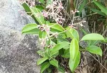 桉叶藤是属于桉叶藤属萝藦科的一种植物。木质藤本,枝攀缘性,具白色乳液。叶对生,长卵形或长椭圆形,先端短突,全缘,革质。夏季开花,短聚伞花序,顶生,花冠漏斗形,先端5裂,粉紫色。瞢薆果2枚水平对生,…全部>>