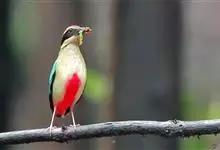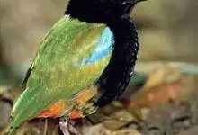 绿胸八色鸫:是雀形目八色鸫科的鸟类,共有12个亚种。体长为16-18厘米,体重65-69克。体型圆胖,尾短,腿长。头黑,上体绿色,两翼深色而具白色斑纹,头顶至后枕深褐,胸及腹部苹果绿,臀亮红。…全部>>