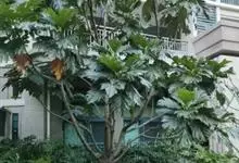 面包树 Fosberg)是桑科波罗蜜属植物。叶大,成熟之叶羽状分裂,表面深绿色,背面浅绿色;穗状花序单生叶腋,雄花序长圆筒形至长椭圆形或棒状;聚花果倒卵圆形或近球形;花期为3~5月,果期为7~10月。…全部>>