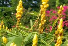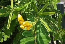 翅荚决明 Roxb.)是豆科决明属灌木植物,高3米。羽状复叶,在叶柄和叶轴上有窄翅;小叶倒卵状长圆形,先端圆钝,基部斜截形;总状花序顶生和腋生;荚果带形,…全部>>