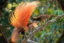 大极乐鸟是极乐鸟属中最大的鸟种。成年雄鸟体长可达到43厘米,雌性可达35厘米。雄鸟的额、颊、喉等墨绿色;头、颈黄色;上体暗赤栗色;腹部葡萄红色,胁部有长饰羽,其基部橙黄,中部黄色,…全部>>