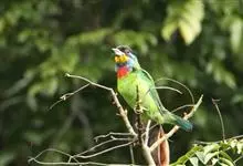 黑眉拟啄木鸟,为须䴕科、拟啄木鸟属的小型鸟类,体长20-25厘米,外形和金喉拟啄木鸟非常相似,但具粗著的黑色眉纹,头侧和耳覆羽以及下喉蓝色而不为银灰色,前颈两侧各有一块鲜红色斑。全部>>